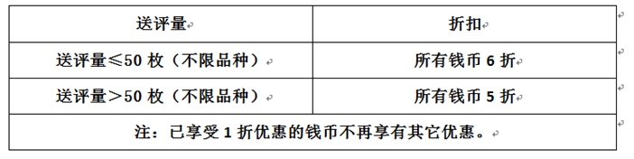 1、現代金銀幣、流通紀念幣,尊享1折送評!(限:市場價值1000元以內,直徑40mm以內,每人每單限3枚);參與本次活動需6枚起送(送評人需在送評時指定享受1折送評的錢幣)。